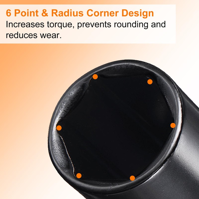 • Feature - 6-Point Socket: 1/2" drive socket features a 6-point design, which provides a larger contact area with the fastener than a 12-point design. It helps to evenly distribute torque and reduces the risk of rounding or damaging the fastener. Adapter: Provides a secure, locking extension to your existing tools. Provides extra length to get into hard-to-reach spaces. Anti-drop spring ball lock ensures a tight fit with the drive head to prevent slipping during use.