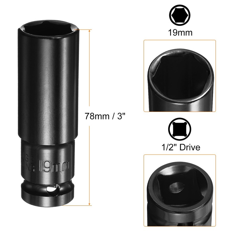 • Size - 6-Point Socket: metric socket size: 19mm, square drive: 1/2", total length: 78mm / 3"; Socket Adapter: hex shank: 1/4"; square drive: 1/2"; total length: 73mm / 2.87".