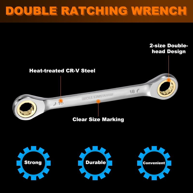 2 size double-head design makes your maintenance work more convenient; The 12-point box-end design provides additional grip and control, and transfers torque evenly to the contact surface to prevent slipping and rounding; the 72-tooth gear ratchet design allows it to swing only once at 5 degrees, allowing it for use even in tight spaces.