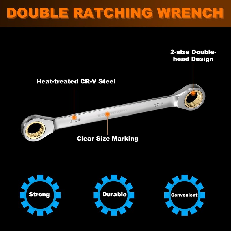 2 size double-head design makes your maintenance work more convenient; The 12-point box-end design provides additional grip and control, and transfers torque evenly to the contact surface to prevent slipping and rounding; the 72-tooth gear ratchet design allows it to swing only once at 5 degrees, allowing it for use even in tight spaces.