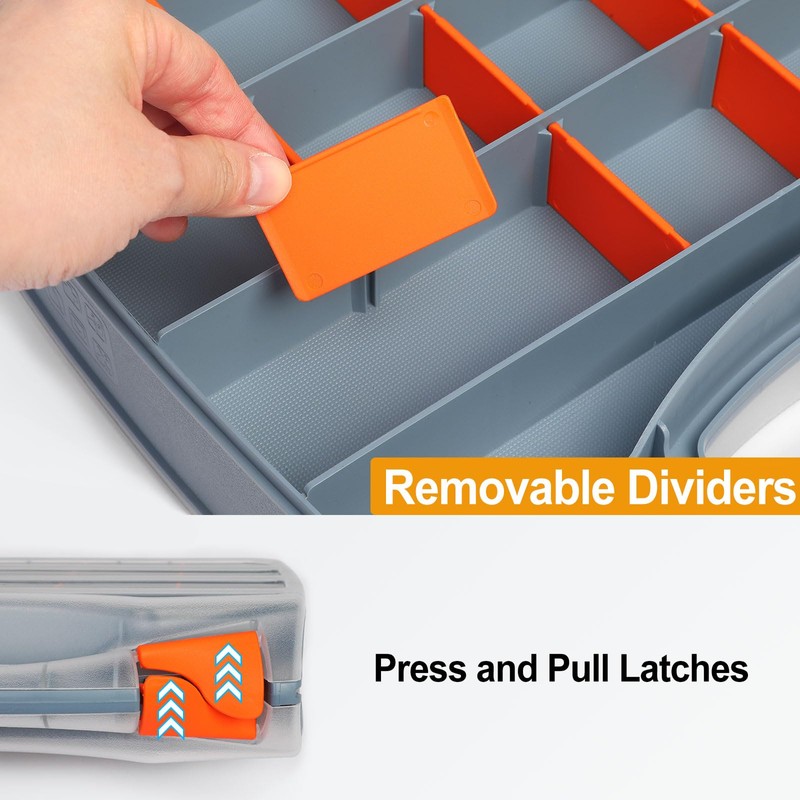 The plastic storage box is equipped with a transparent cover, so you can quickly find the parts or hardware you need, and the internal compartments are removable and the position of the compartments can be adjusted according to the size of the items, suitable for personal or professional use.