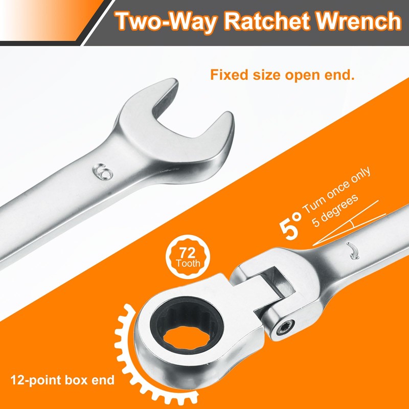 - Feature - 180° flex head of metric ratchet combination wrench can reach the most difficult-to-reach fasteners, and can achieve maximum flexibility and ease of use in a small space. Its anti-slip tooth design provides a firm grip, fits tightly to the fasteners, prevents sliding.