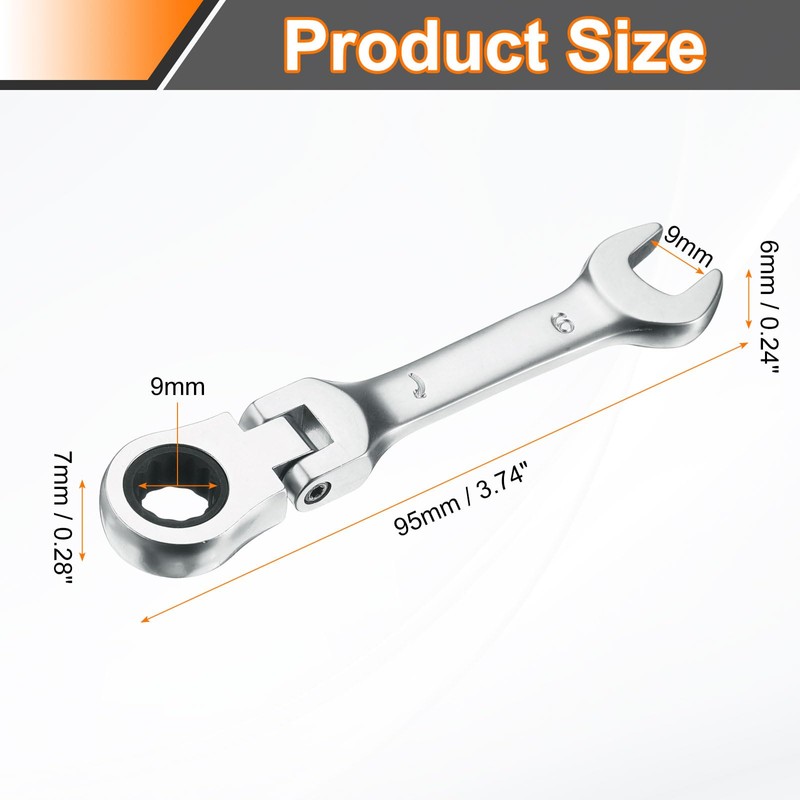 - Size - 12-point Box End Size: 9mm; Open End Size: 9mm; Total Length: 95mm / 3.74"; 12-point Box End Thickness: 7mm / 0.28"; Open End Thickness: 6mm / 0.24"; Rotation Angle: 180 degree; Ratchet Teeth number: 72 teeth.