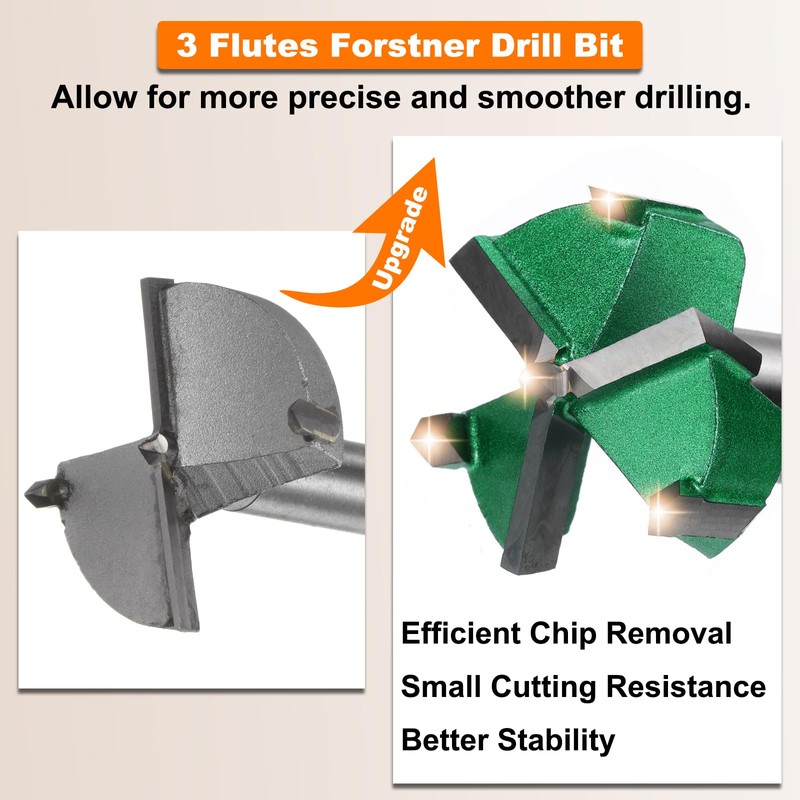 Upgraded 3-flute 4-spur forstner drill bit facilitates efficient chip evacuation and reduces cutting resistance, helping to create a cleaner entry hole and providing better stability. The extra flutes and spurs allow for a more precise and smoother drilling, making it suitable for projects that require high precision and a high finish.