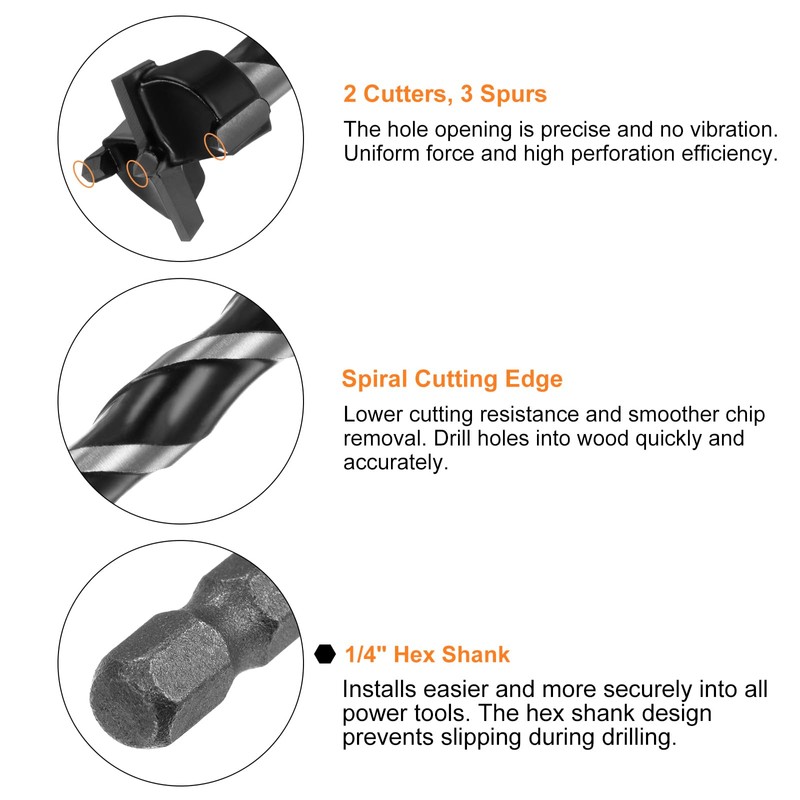- Features - The spur help guide it through wood and ensure accurate start holes, reducing slippage. The head adopts arc curve design head for easy chip-removal, more efficient perforation. Drill precise, smooth, and neat holes without burrs.