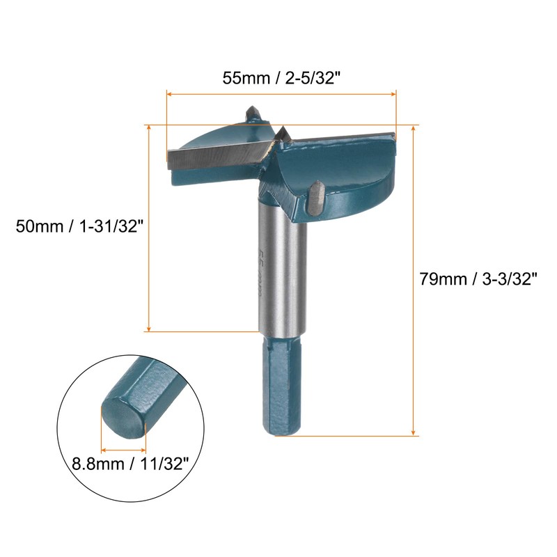 - Size - Drilling diameter: 55mm / 2-5/32"; shank size: 8.8mm / 11/32"; drilling depth: 50mm / 1-31/32"; total length: 79mm / 3-3/32"; style: 2 cutters, 3 spurs; shank type: hex shank (grips the chuck or extension adapter securely and increases torque transmission.)