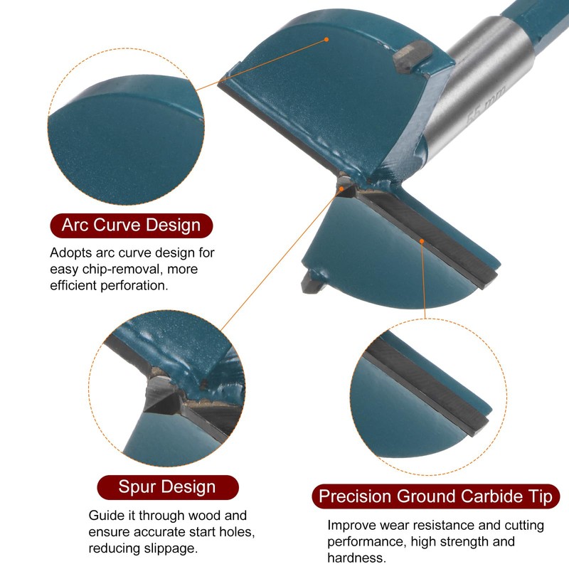3 spurs help guide it through wood and ensure accurate start holes, reducing slippage. Arc curve design head for easy chip-removal, more efficient perforation. Forstner drill bit enables precise, fast and clean drilling.
