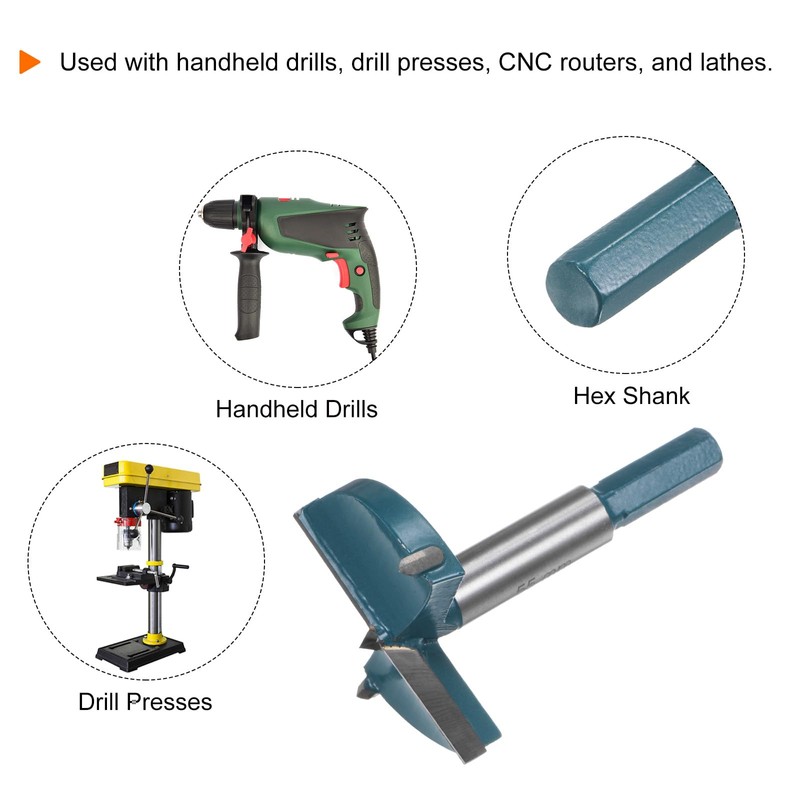 The forstner drill bit can be used with handheld drills, drill presses, CNC routers, and lathes. Recommended to use on desktop (fixed) equipment. The hex shank grips the chuck or extension adapter securely and increases torque transmission, reducing slippage inside the chuck.