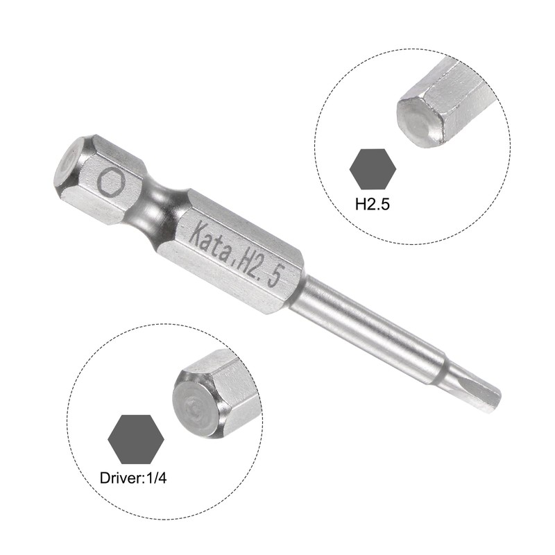 • Size - H2.5 Hexagon Head, 1/4" Hex Shank, 2" (50mm) total length.