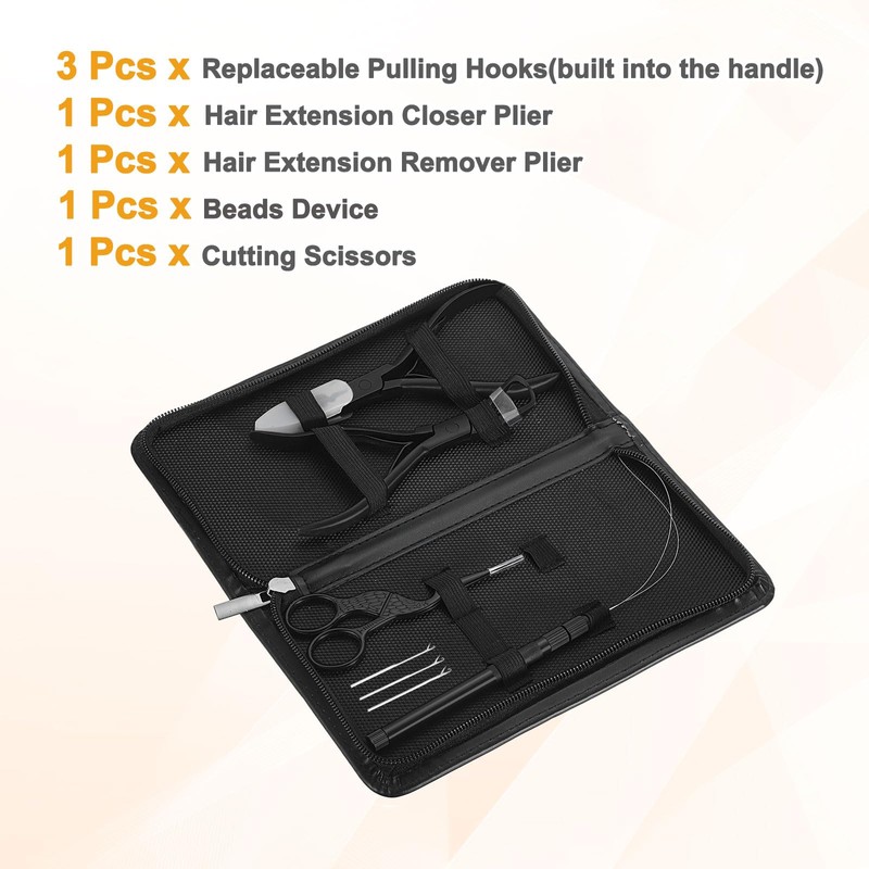 - Size - Hair Extension Micro Beads Closer Plier Length: 130mm / 5", Hair Extension Beads Remover Plier Length: 150mm / 6", Package Content: 1pcs x hair extension micro beads closer plier, 1pcs x hair extension beads remover plier, 3pcs x pulling hooks (built into the handle), 1pcs x beads device, 1pcs x hair cutting scissors and 1pcs x storage zipper box.