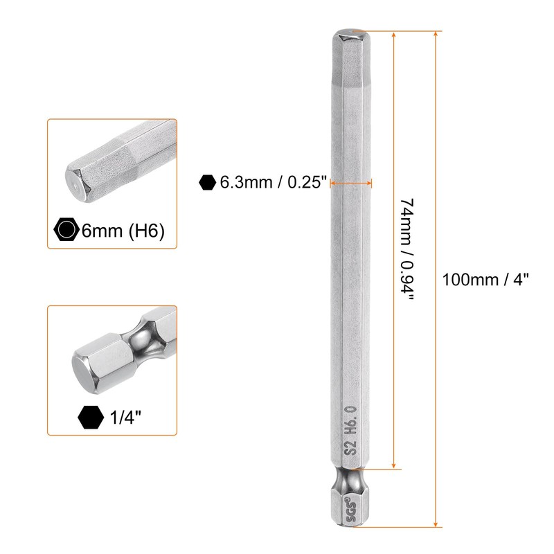 • Size - Hex wrench drill bit size: 6mm (H6), hex shank size: 1/4", total length: 100mm / 4", rod dia.: 6.3mm / 0.25", effective rod length: 88mm / 0.94", hardness: HRC58-60. Each hex screwdriver bit is clearly engraved with size number for easy identification.