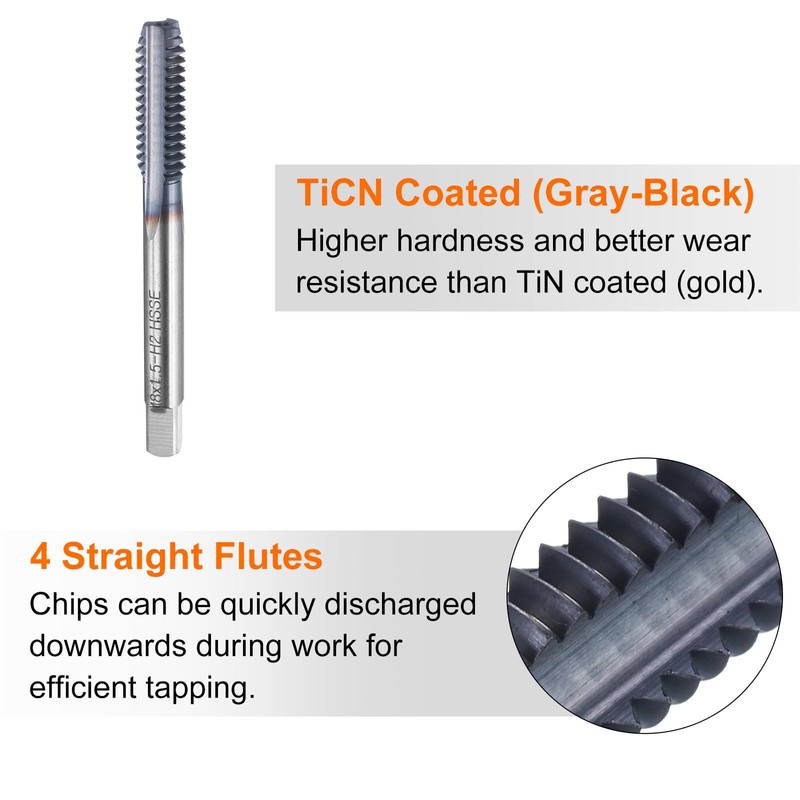 - Material - By adding 5-8% cobalt to general 6542 high speed steel plug tap, metric taps with cobalt can have higher hardness and precision, better wear resistance and toughness, and higher heat resistance.The surface is coated with TiCN (gray-black), which has higher hardness and better wear resistance than TiN coating (gold).