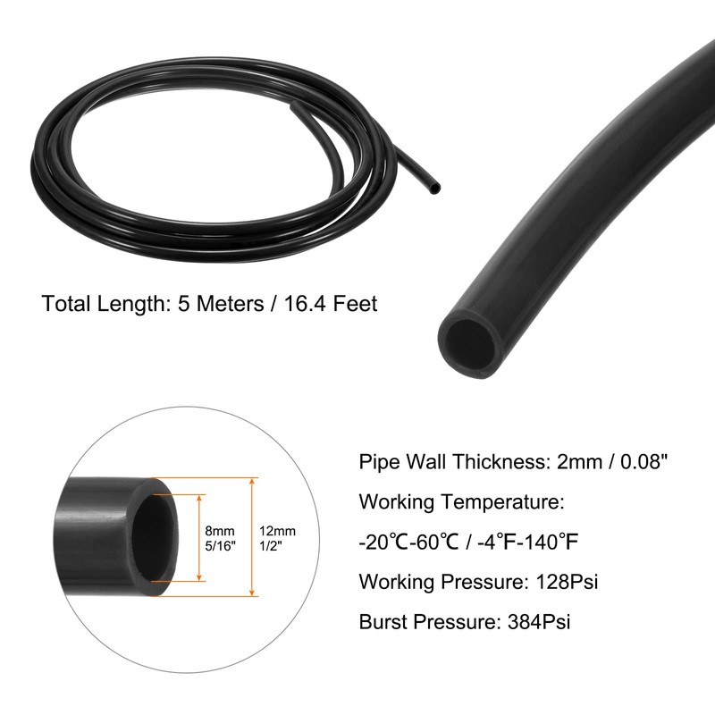 - Size - Outside Diameter: 12mm / 1/2"; Inside Diameter: 8mm / 5/16"; Total Length: 5 Meters / 16.4 Feet; Pipe Wall Thickness: 2mm / 0.08"; Working Temperature: -20℃--60℃ / -4℉-140℉; Working Pressure: 128Psi; Burst Pressure: 384Psi; Package Includes: 1 x Pneumatic Tubing Pipe Pu Hose.