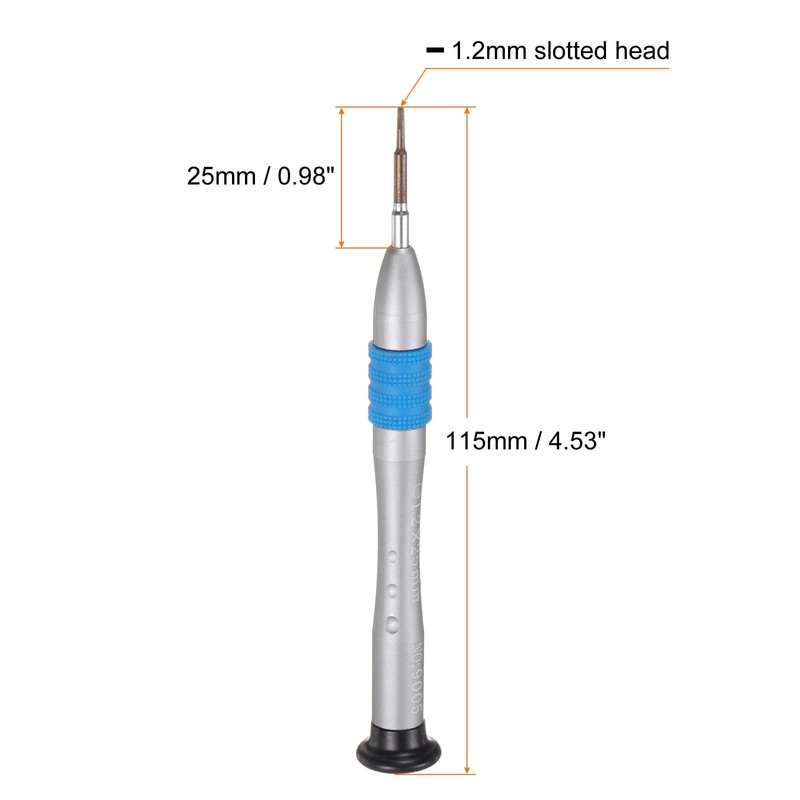 - Size - 1.2mm slotted head, 25mm / 0.98" bit length, 115mm / 4.53" total length. Aluminum alloy steel handle, comfortable hand feeling, with special anti-slip design and 360° rotation cap.