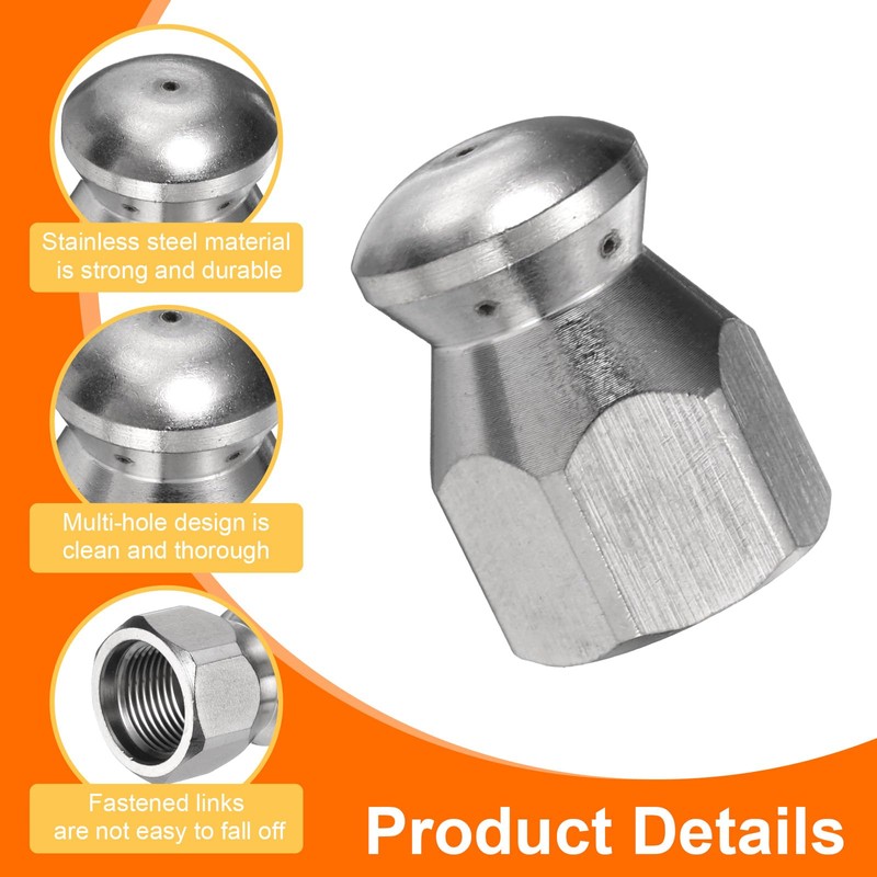 - Feature - The jet nozzle features a practical multi-functional multi-hole design, with one front jet and six rear jets. The front jet orifice is designed to remove stubborn blockages, providing a stronger impact force and cleaning effect. The six rear jet orifices flush away loosened debris from the front jet, ensuring comprehensive and thorough debris cleaning and thus improving cleaning efficiency.