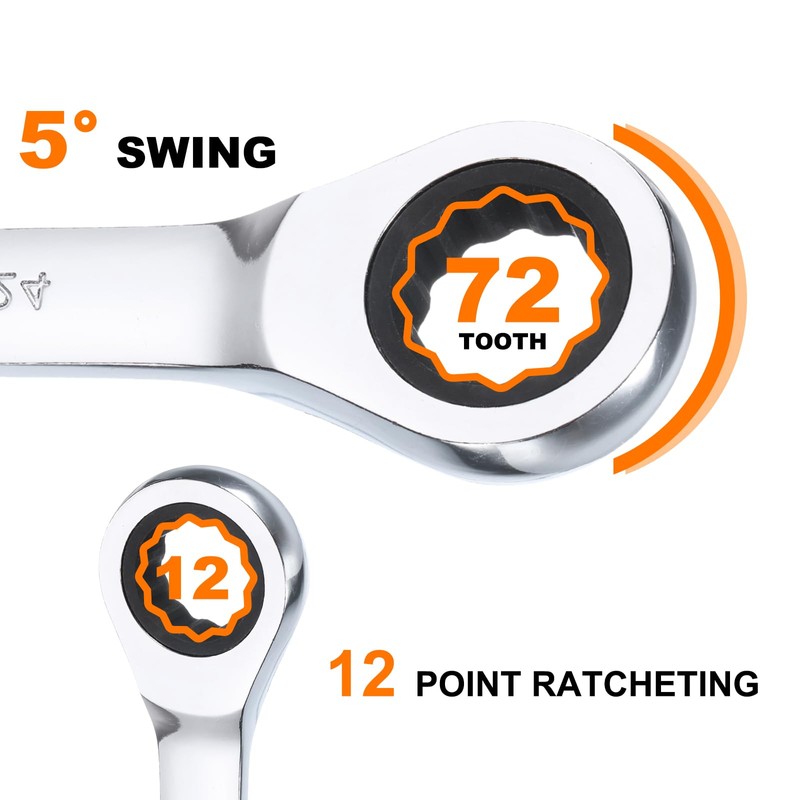 - Feature - Double-head design makes your maintenance work more convenient. The 12-point box-end design provides additional grip and control, and transfers torque evenly to the contact surface to prevent slipping. The 72-tooth ratchet design allows it to swing only once at 5 degrees, allowing it for use even in tight spaces.