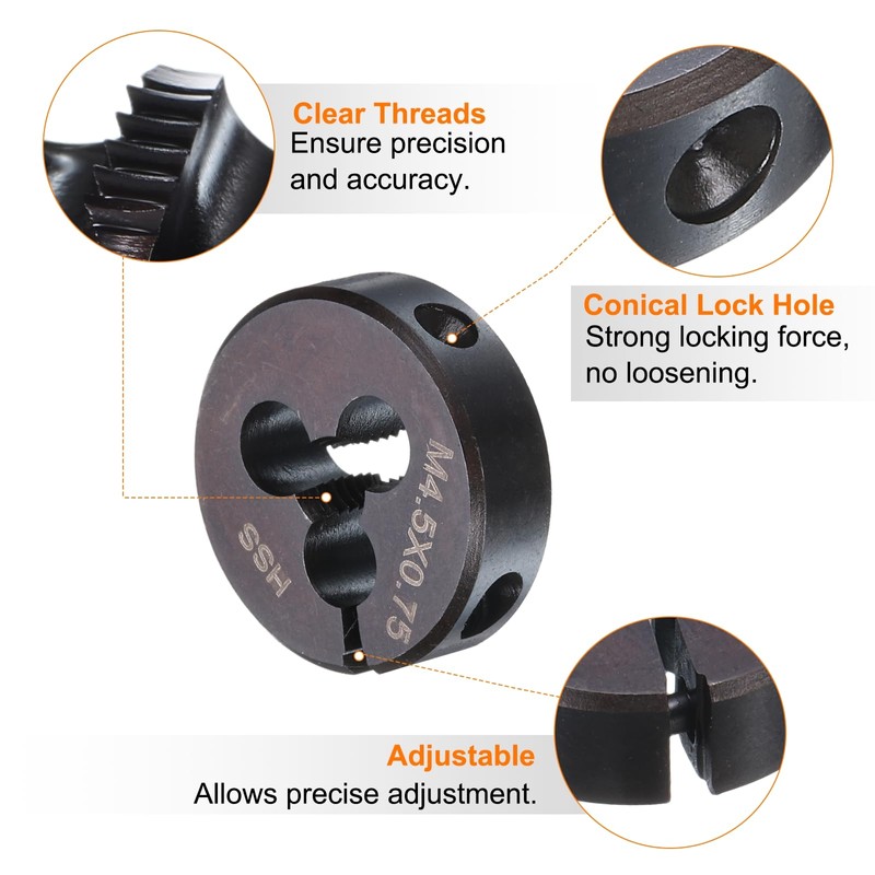 - Features - Conical lock hole, strong locking force, not easy to loosen. Grease the surface to prevent rust, clear threads, and easy maintenance. In addition, the thread die is easy to use and can be used with the die stock (also called die handle or die wrench). It should be reversed every 1/4 to 1/2 turn to facilitate the discharge of chips from the chip removal hole.