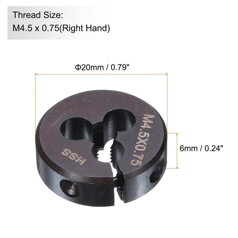 - Size - Metric Thread Size: M4.5 x 0.75; Outer Diameter: 20mm / 0.79"; Thickness: 6mm / 0.24"; Cutting Direction: Right Hand; Style: Adjustable Die. The round die can process, correct, or clean external threads.