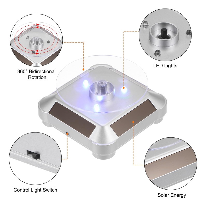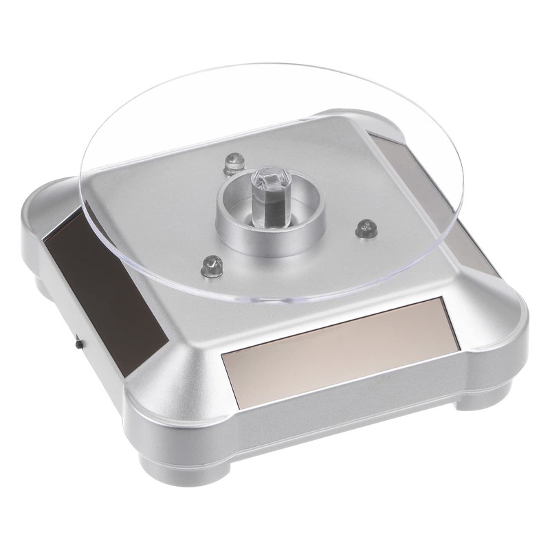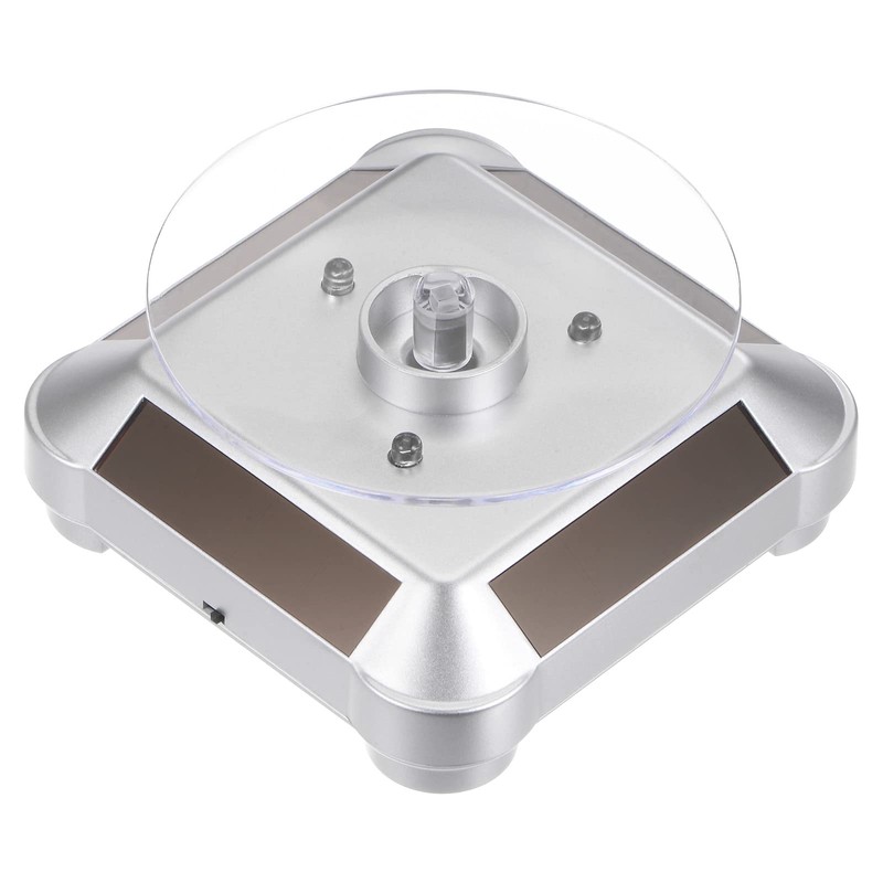 - Feature - The solar rotation showcase is dual powered and can be rotated by solar power or an AA battery. It supports 360-degree rotation with stable balance, the speed of the turntable changes with the intensity of the light, and can be manually reversed in the direction of rotation.
