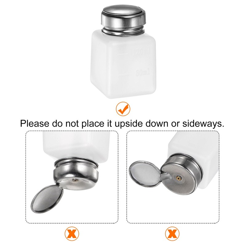 Plastic push-down dispensers are good for alcohol, acetone, skin care products water emulsion essence, cleanser, nail polish remover, makeup remover and more. Do not place it upside down, just stand upright to prevent solvent leakage, evaporation and corrosion.