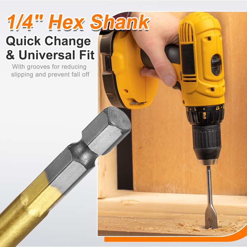 • Quick Change Hex Shank - The spade drill bit features a quick change 1/4" hexagonal shank with grooves designed to minimize slipping and prevent it from falling off, ensuring safety during use. It allows for smooth and efficient drilling and is suitable for most brands of drill driving tools available.