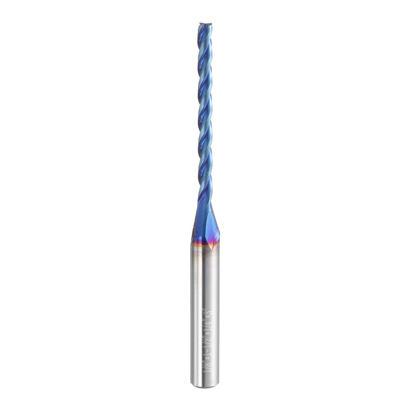 HARFINGTON Spiral Router Bit 1/8" Cut Dia 1/4" Shank Up Cut Blue Nano Coated Solid Carbide 3 Flutes CNC End Mill Milling Bits for Wood Plastic Soft Metal (1-1/2" Cut Length 3" Long)