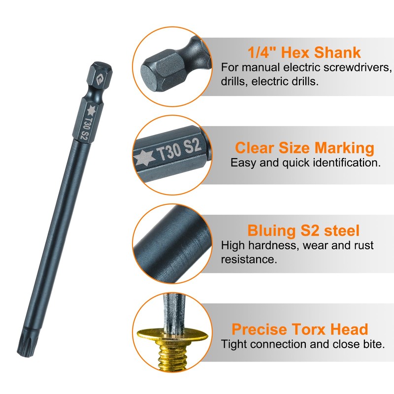 • Size - Torx Bit Size: T30, Hex Shank Size: 1/4", Total Length: 100mm / 4", Rod Diameter: 6mm / 0.24", hardness: HRC58-62. Each magnetic torx drill bit is engraved with a clear specification for easy and quick identification.