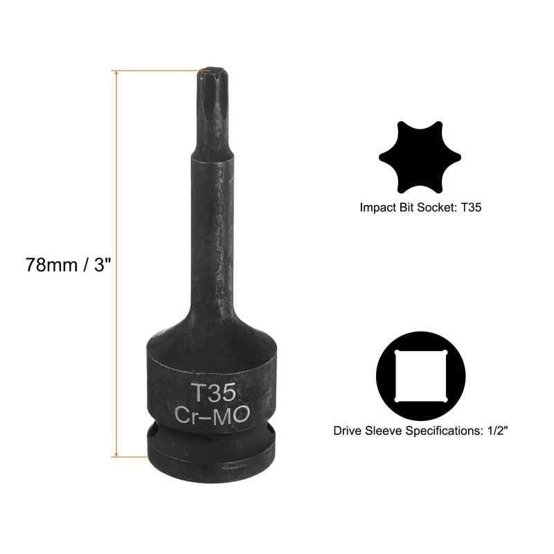 - Size - 1/2" impact drive socket, T35 torx bit socket, 78mm / 3" total length. Suitable for working in high-torque environments.