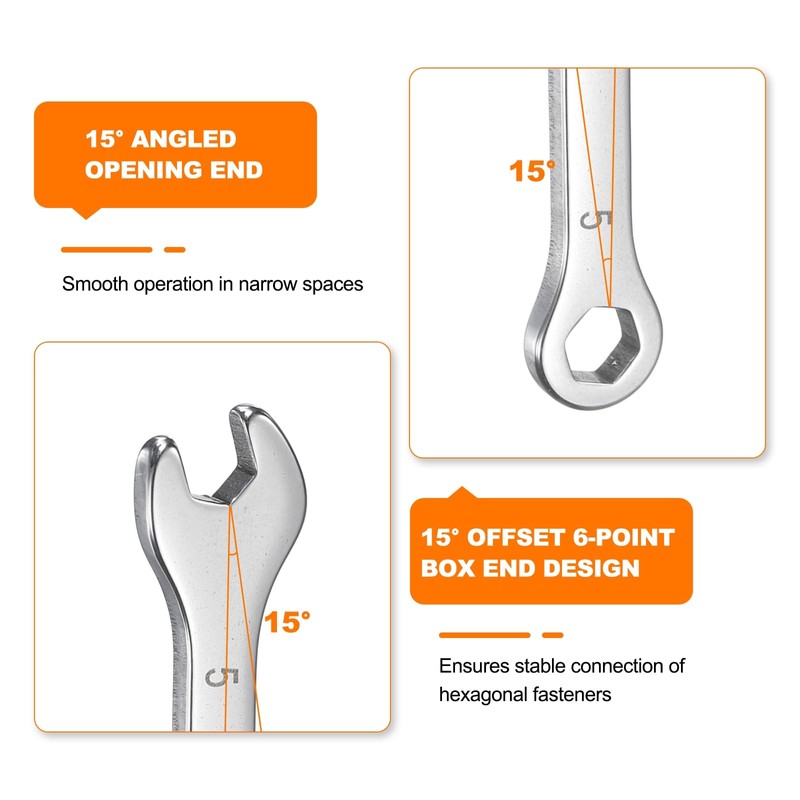 • Angled Wrench - The wrench opening is tilted 15°, which allows for quicker wrench flipping and improved work efficiency; the four-point force application provides a high fit with the screw and a more secure fix. The 6-point box end design ensures a stable connection of the hexagonal fastener and prevents slipping during operation. The small size and ultra-thin design allow for smooth operation in narrow spaces. The size markings allow for quick and easy identification.