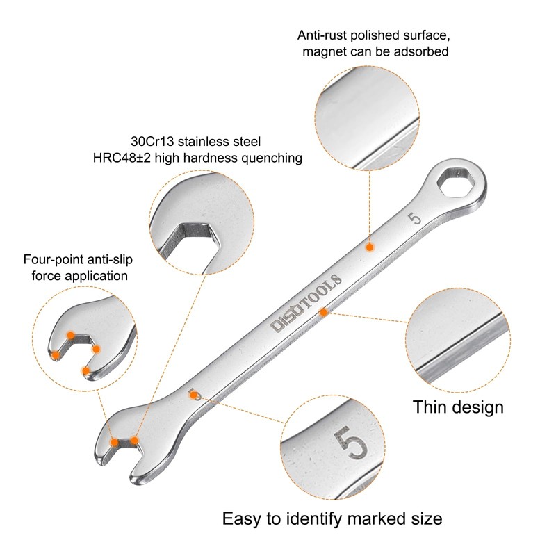 • Size - Specifications: 5mm / 0.20" ; Open offset Angle: 15°; Total length: 81.5mm / 3.21" ; Rod thickness: 3mm / 0.12"; Package content: 1pcs Thin Combination Wrench.