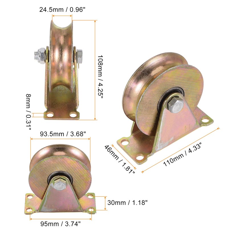 - Size - Wheel Diameter: 93.5mm / 3.68"; Total Height: 108mm / 4.25";Groove Width: 24.5mm / 0.96"; Hole Diameter: 8mm / 0.31";Bracket Length: 110mm / 4.33";Bracket Width: 46mm / 1.81"; Hole Spacing Size: 30x95mm / 1.18"x3.74"(L*W); Capacity Per Wheel: 1000kg / 2204 lbs.