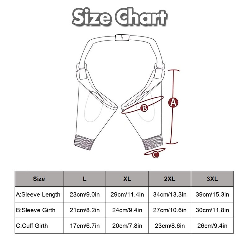 3XL: Sleeve Length 15.3''. inch, Sleeve Girth 11.8'', Cuff Girth 9.4''.