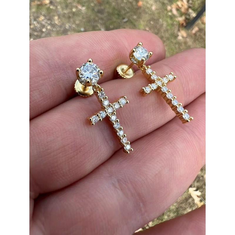 Harlembling Real MOISSANITE 14k Gold Plated Dangle Cross Studs Earrings Iced Passes Tester
