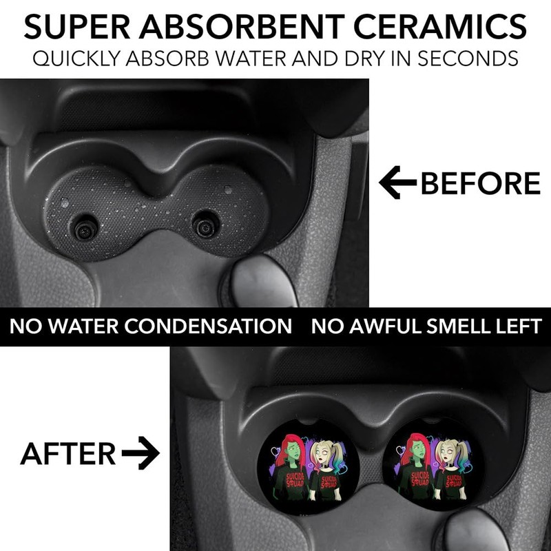 - PACK OF 2: This set includes 2 round ceramic coasters with a diameter of 2.5" and a thickness of 0.20" designed to fit cup holders in most cars, vans, boats, SUVs and trucks. *Before purchasing, measure the diameter of your car cup holder to ensure compatibility with our coasters.