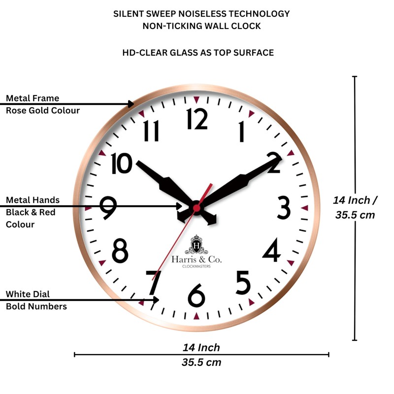 HARRIS & CO. CLOCKMASTERS ( 14 inch Premium Luxury Metal Wall Clock with Glass and Silent Sweep Noiseless Technology, Rose Gold Metal Frame Model Name - Coventry Street