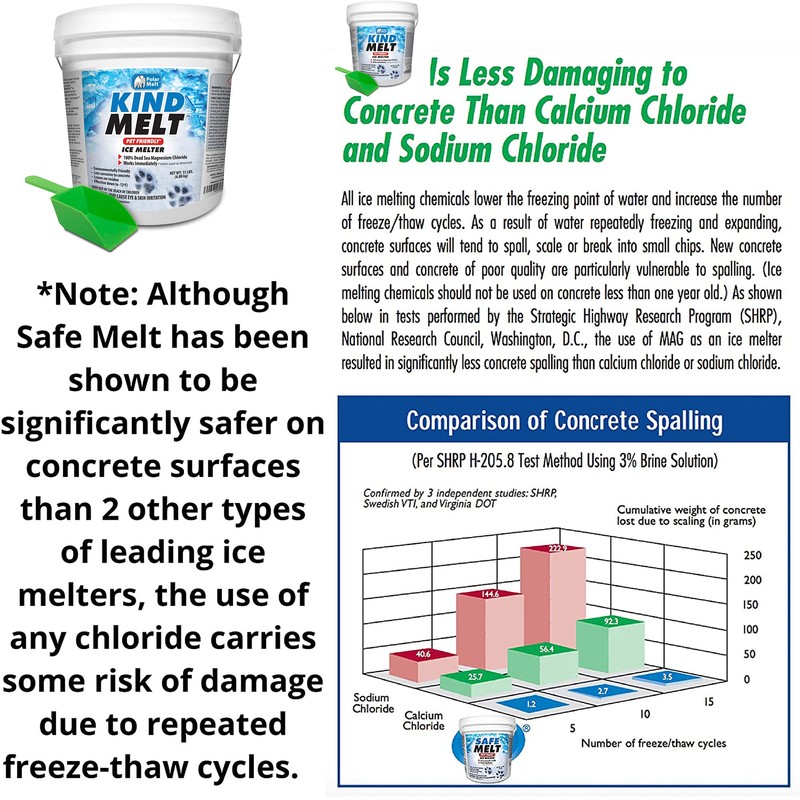 - Less Corrosive - Kinder to the environment than traditional rock salt ice melters and less corrosive to concrete than sodium chloride and calcium chloride