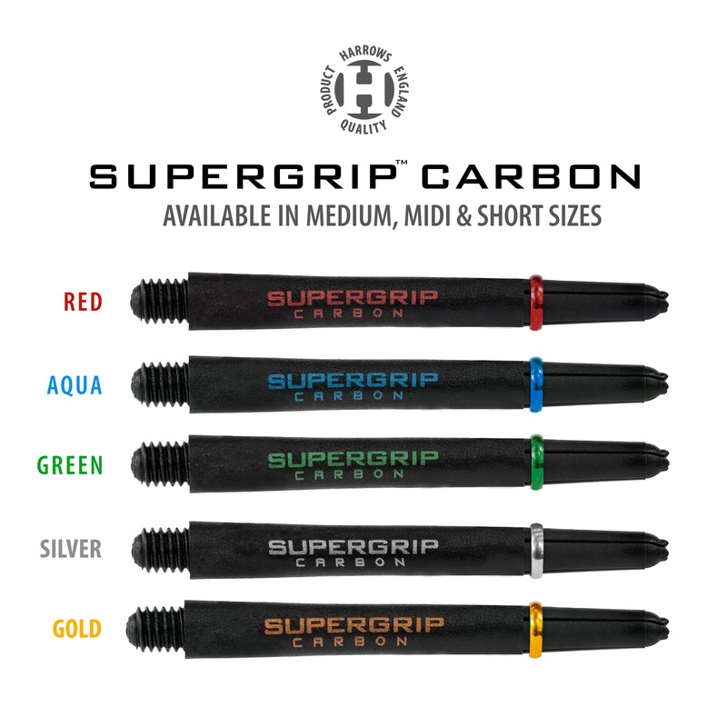 - DURABLE DART CHAMPIONSHIP Elevate your dart game with the Harrows Supergrip Carbon Gold Shafts! Made with a unique carbon composite, these carbon shafts redefine durability to ensure you dominate the dartboard with style and precision.