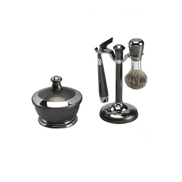 Shave in style with this black and chrome plated premium shave set. It comes with all you need to get the perfect shave and its attractive enough to display. Includes a stand, razor, bowl with cover (mirror inside), shave soap and natural bristle brush. The brush alone is worth the purchase of the set to get a great lather. Consider giving this to the man in your life this season.