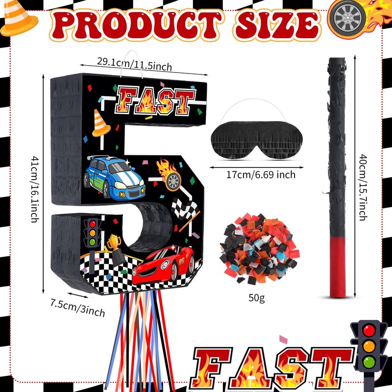 - Package Includes: you will receive 1 piece of race car number 5 piñata boy, 1 stick, 1 blindfold and a bag of confetti, it combines racing elements with number 5, bright colors and nice printing, very trendy among boys and girls, enough to meet your race car 2nd birthday party decoration needs
