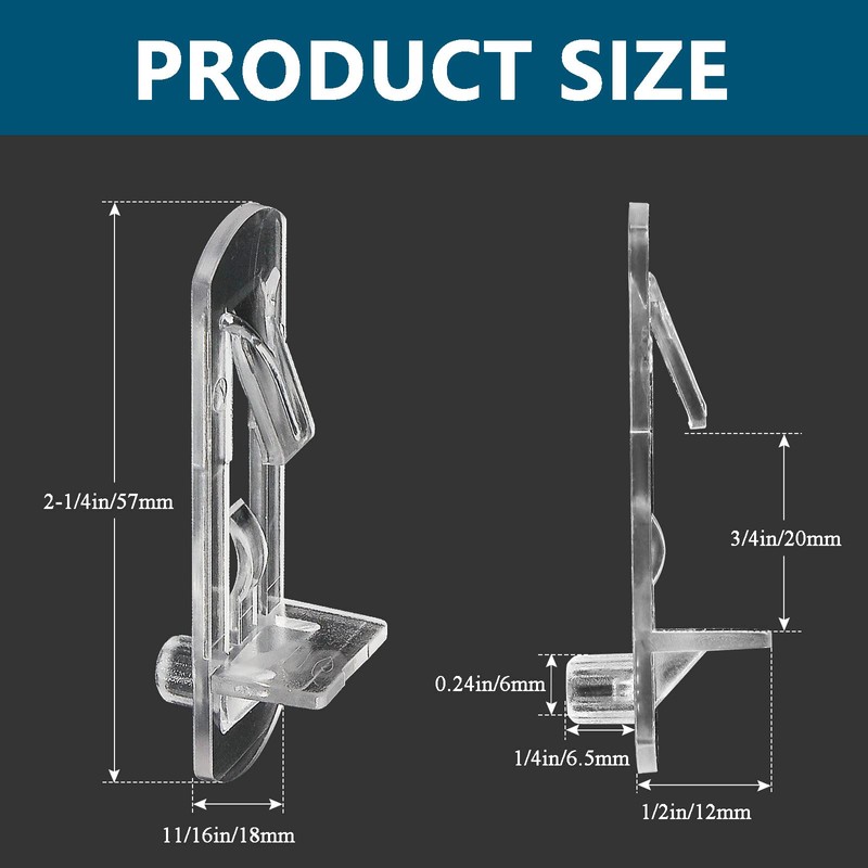 - Package List: Including 20pcs makeup shelf pins for 3/4 inch(20mm) thick shelves, 0.24 inch(6mm) diameter holes; Nail length is 1/4 inch(6.5mm). Please make sure the product size especially the hole size is suitable for your furniture before purchase.