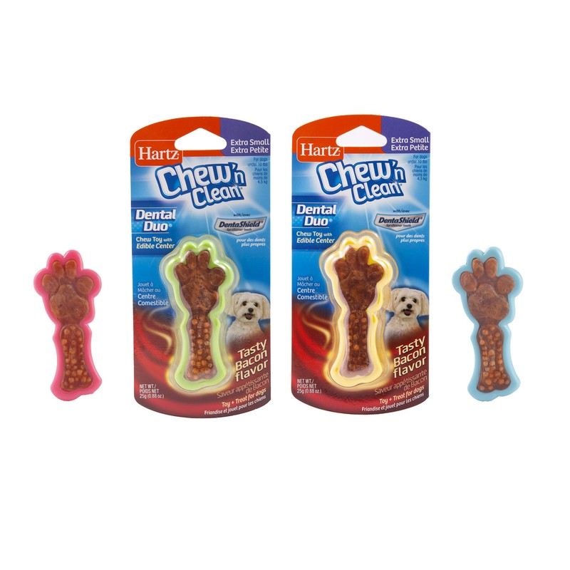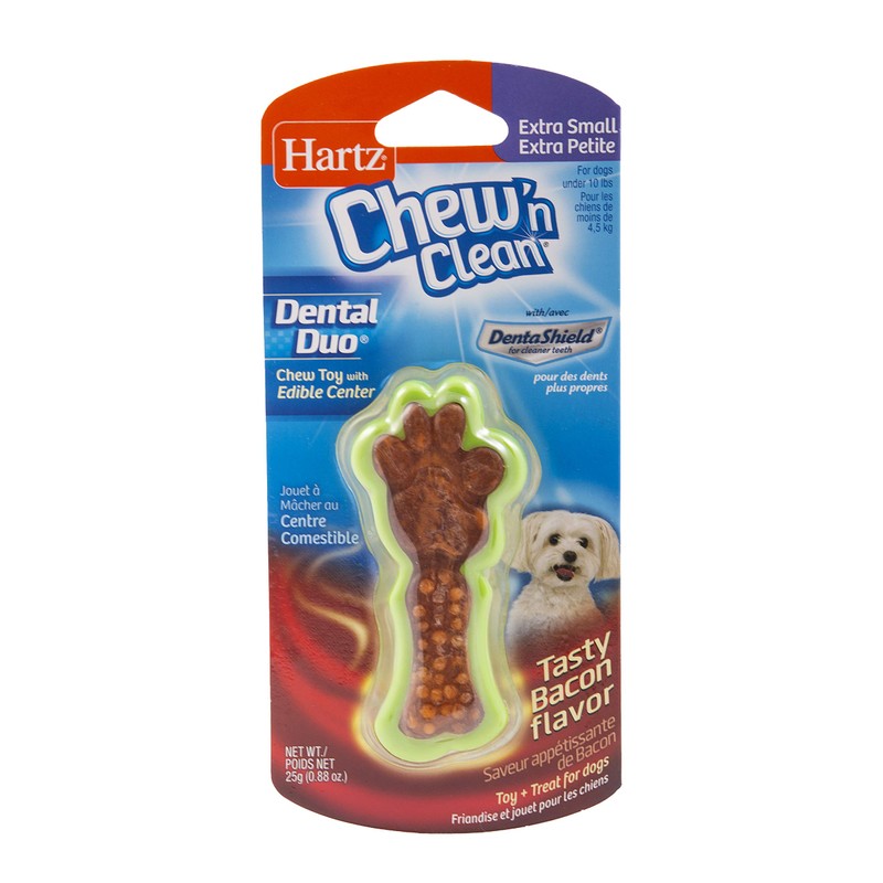 Your dog is hard-wired to chew, chew, chew. Encouraging this instinctual behavior by providing your canine companion with an appropriate chewing item can promote mental and emotional wellbeing along with dental benefits. The Hartz Chew 'n Clean Dental Duo is a long-lasting chew toy and treat all in one! It's constructed from durable materials that withstand mild to moderate chewing. Enriched with a delicious, edible bacon flavored center and our DentaShield technology, the Dental Duo reduces new tartar formation by bonding with components in your dog’s saliva. The chewing action helps reduce tartar build-up, freshen breath and promote healthy gums. Available in a variety of sizes and colors to suit every dog's needs. Remember to supervise your pup with any toy.