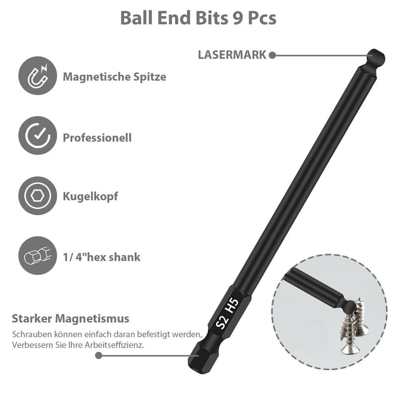 • 9Pcs Ball End Hex Bits: This torx bit set includes 9 essential sizes,H1.5, H2, H2.5, H3, H4, H5, H6, H8, H10.100mm ball end hex bits with clear markings. Perfect for professionals and DIYers needing a comprehensive 1/4" hex shank solution.