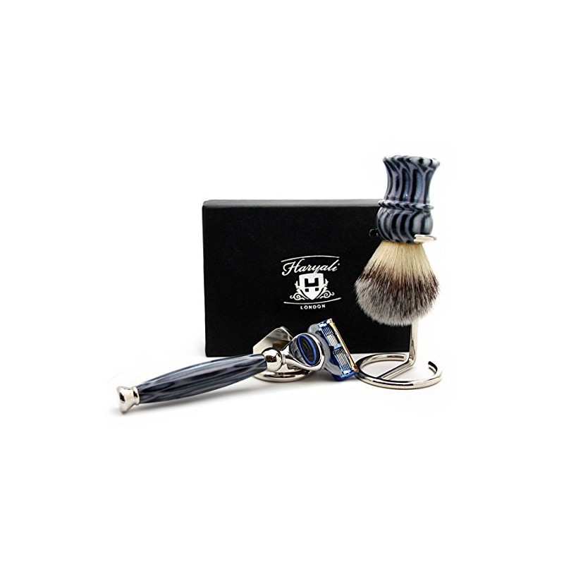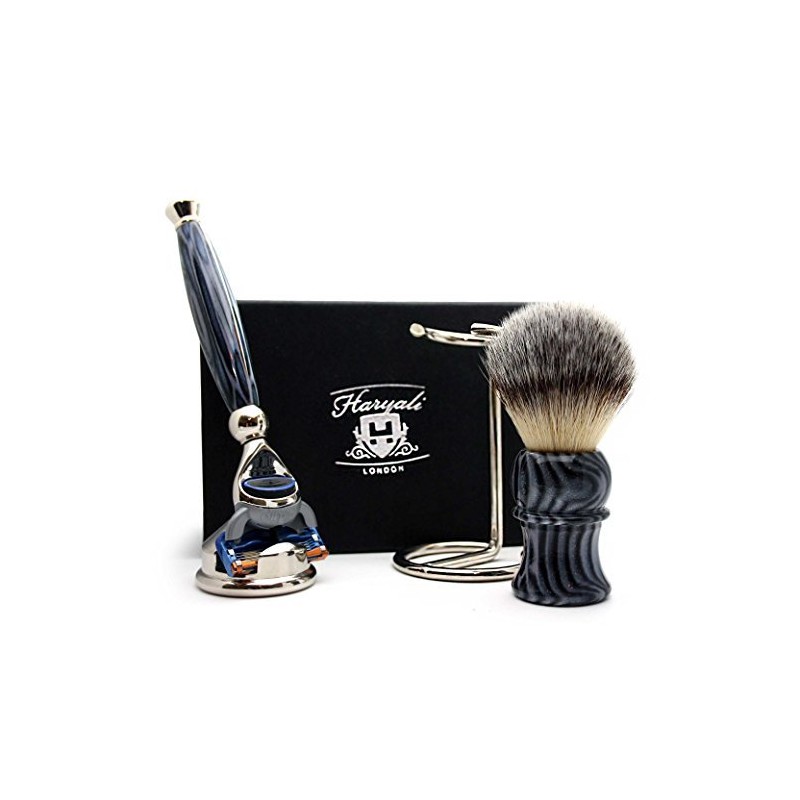 Haryali London 4 Pc Mens Shaving Kit 5 Edge Razor with Synthetic Badger Hair Shaving Brush, Stainless Steel Razor Stand and Brush Stand Perfect Set for Men