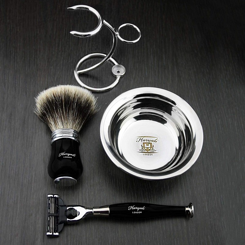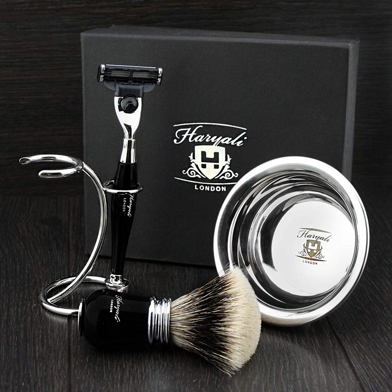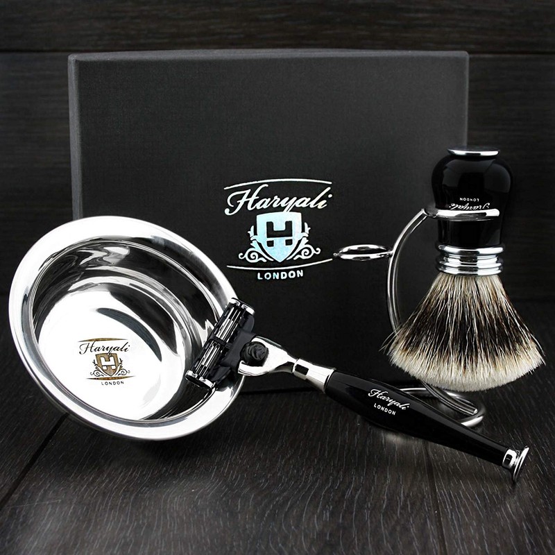 Haryali London Black Luxury Men's 3 Edge Shaving Set, Shaving Brush, Stand and Shaving Bowl