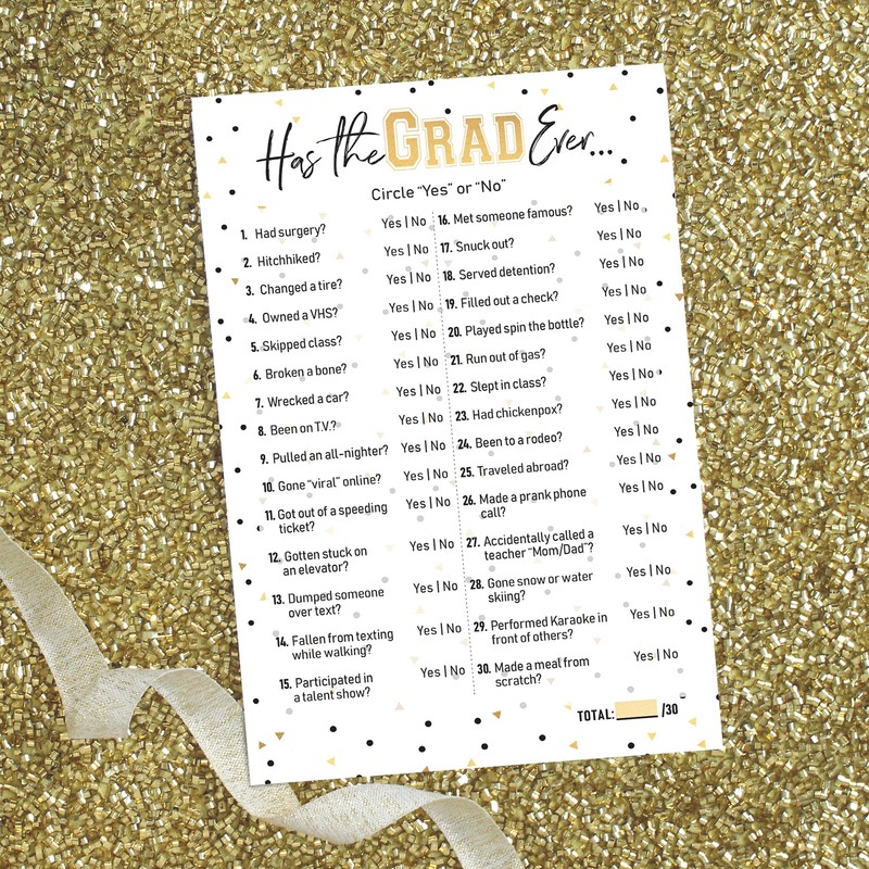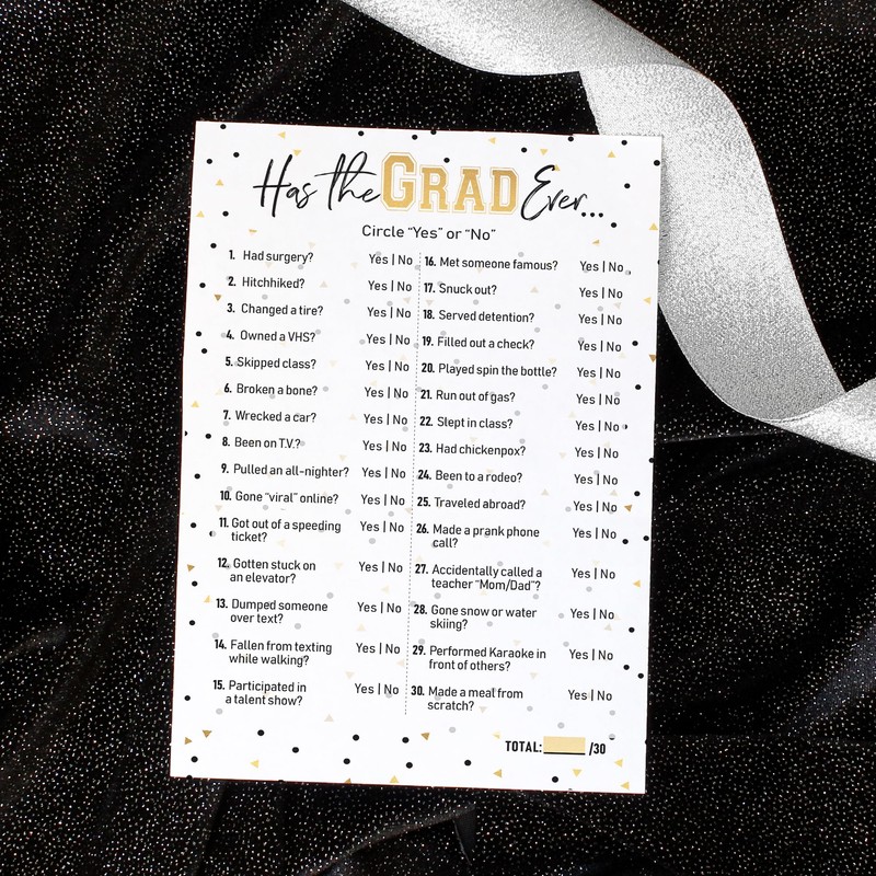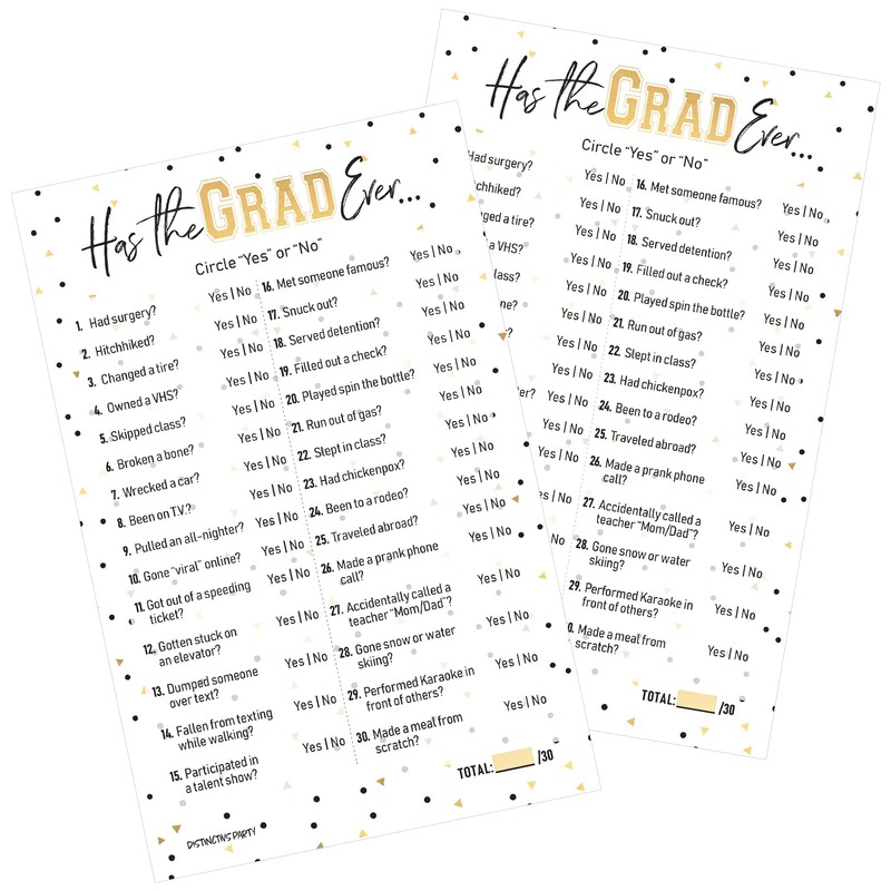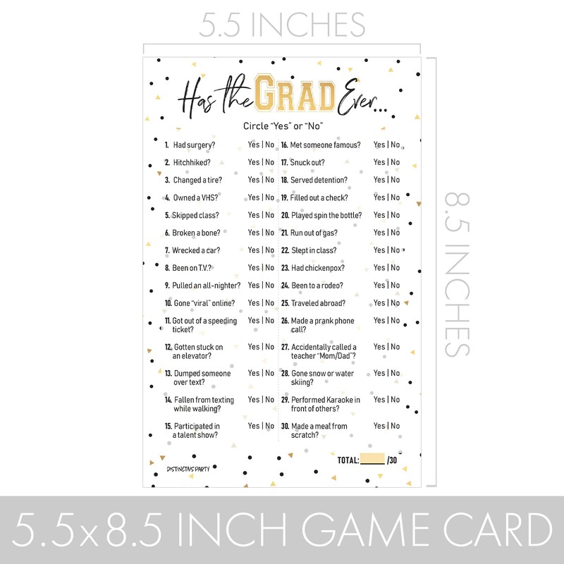 • 25 CARDS: Has the Grad Ever graduation party game cards made to match a black and gold graduation party.