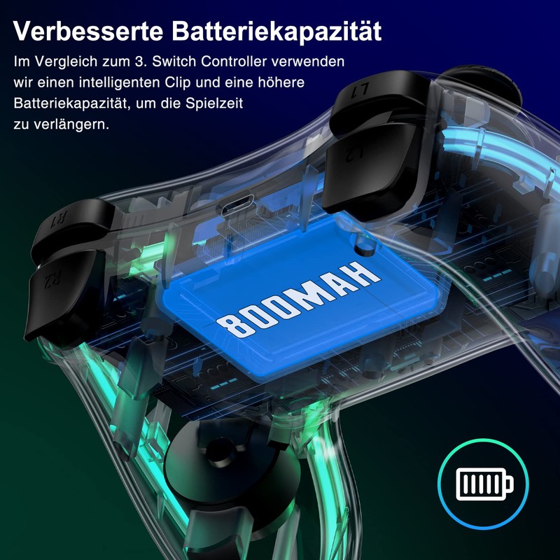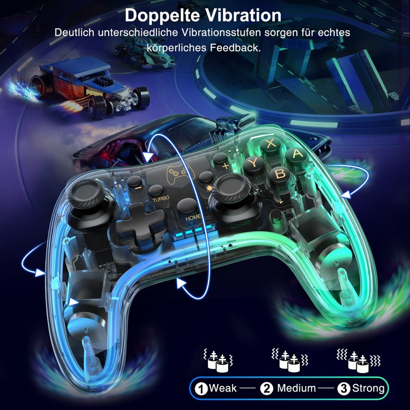 - Cooler Look ----Switch Controller ist aus PC-transparentem Material, rein und transparent, die interne Verdrahtung ist deutlich sichtbar, reich an technologischen Elementen, die Randkontur des Griffs ist mit Lichtleitstreifen eingebettet, verschiedene Farb-Licht-Kombinationen kollidieren, um brillante Lichtfarben zu schaffen, so dass der Griff Lichteffekt schillernd und variabel, mit individuellen Lichtsteuerung Tasten, sehr cool.