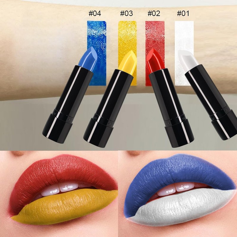 - Halloween Make-up Lippenstift-Set: Enthält 4 hochpigmentierte Lippenstifte in den Farben weiß, gelb, rot und blau, mit denen sich eine Vielzahl von Halloween-Motiven wie Clowns, Zombies, Gespenster und Monster sowie andere klassische Looks kreieren lassen.
