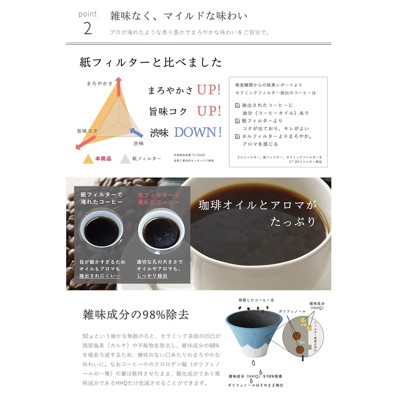 - 【Changes to a mild and clean taste!? The ceramic far-infrared and myriad of 50 micron holes extracts coffee oil. It also removes residual chlorine and impurities so it is mild. Even the most challenged brewing speeds you can achieve the maximum taste of your coffee