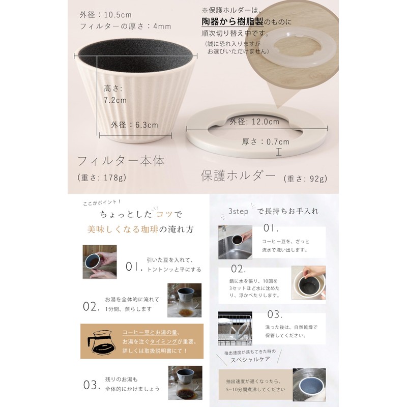 | Size: | ドリッパーのサイズ:外径10.5cm ・内径9.6cm ・高さ7.2cm |