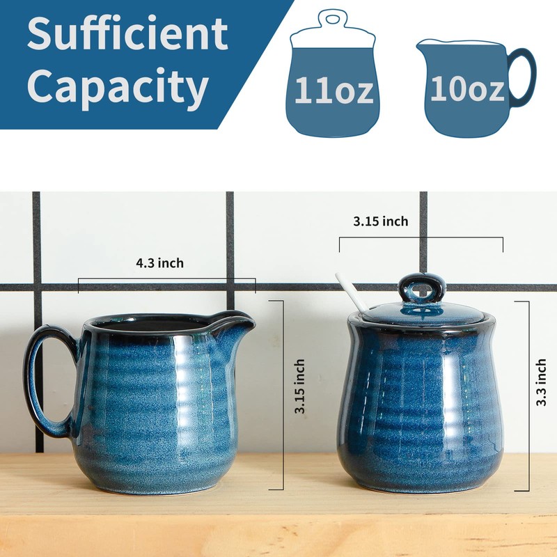 - 【Unique Color】The color of our sugar and creamer set is unique in the market. The unique navy blue color is a delight to the eye. In addition to being a milk jug, it is also an artifact that can be placed on the dining table,kitchen and coffee bar to enhance the artistic atmosphere of the home. artifact that can be placed on the dining table,kitchen and coffee bar to enhance the artistic atmosphere of the home.